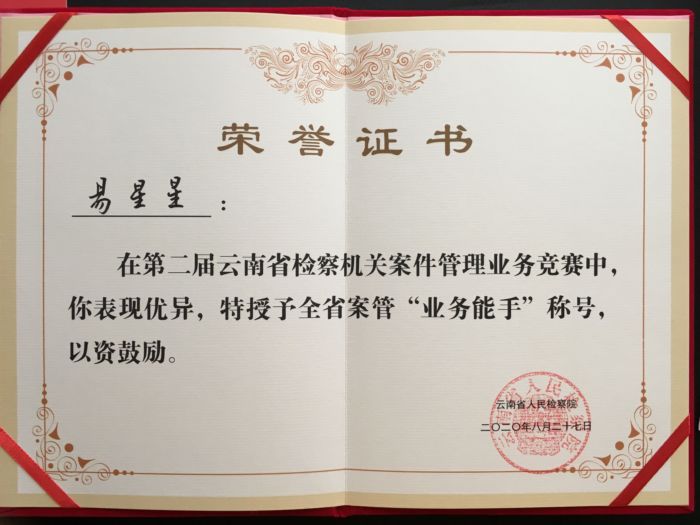 易星星同志在竞赛中沉着冷静,积极应对战,展现了娴熟的案件管理业务。据悉,这是易星星同志继2018年6月获得云南省检察机关“案件管理岗位能手”后,第二次获奖。