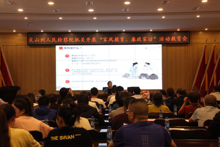 活动邀请文山学院党委(校长)办公室主任王焱作题为《弘扬优良家风,涵养检察文化》家风建设讲座,王焱老师从弘扬中国传统家风文化的时代意义、中国传统家风文化的核心思想、中国传统家风文化的传承方式等三个方面深入浅出地讲述了中华民族博大精深的家风文化,解读了中华优秀传统文化的“精神密码”,大家纷纷表示深刻感受到了中华民族家庭美德的时代内涵,感悟到了优良家风的向善力量。